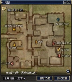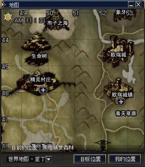 在地图窗口中,新加入了左上角的游戏时间显示,其显示的为游戏内的时间,白天黑夜让人一目了然,终于摆脱了从前观天计时的原始状态。各大城镇村庄,也在地图上加入了“加号”的标志,点击可进入本次地图**的又一亮点――村庄小地图。而本人所在的位置,除了在地图上有标记显示外,三章中还加入了窗口下方的文字显示,清楚表明了目前所地的区域名,移动地图查看其他地方后,还可点击“我的位置”,立即切换到地图上自己所在的地点。