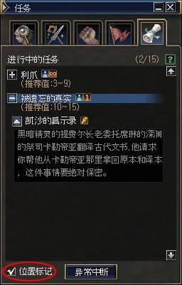 配合任务系统里新增的标记功能,还能让任务NPC显示在地图中。要开启这一令人幸喜的新功能,只要勾选任务窗口中的“位置标记”,然后点击需要标记提示的任务名即可。