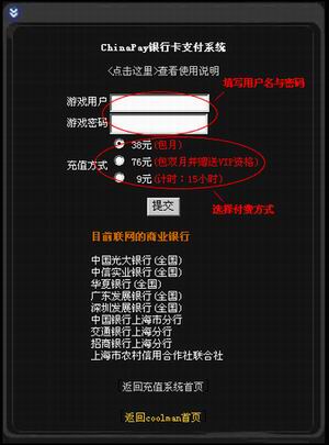 ChinaPay银行卡支付系统由坤迈公司自主研发,与银联支付网络对接。跟传统充值方式相比,通过ChinaPay银行卡支付系统为《星际Online》充值,拥有快捷、方便、安全等多项优点,与玩家帐号直接挂钩,无需烦琐的充值序列号与密码,只要轻轻点击鼠标,即可获得等额的充值点数。