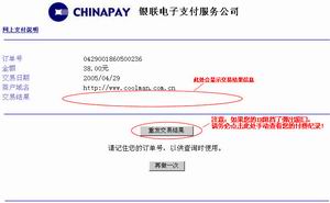 第五步:ChinaPay银行卡支付系统会提示您所交易的结果。 (提示:如果您安装了最新的微软安全补丁,可能将无法看见所弹出的窗口,此时请务必单击“重发交易结果”手动查询支付结果确认。)