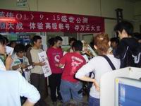 有的网吧还没到活动时间,就已经有玩家在那边早早等待,还有些因各种原因迟到的玩家简直是冲锋进来。生怕比别人少了些练级时间。这些“游戏人”一进门就坐在电脑前狂打着三国,证明他们已经被三国的游戏给吸引了,有的玩家一进去就开始招募人员组对组团,这也正是为“百团大战”做铺垫。各地还同时推出了赠送周边的小活动。在武汉,前二十位参加活动的玩家或获赠统一冰红茶一瓶,统一方便面一包。杭州地区的前24位到场的玩家则可以获得百事可乐一瓶和电攻杂志一本。成都送出的是精美杂志和《三国群英传Online》限量版扑克牌,先到先得让玩家玩的高兴,拿的开心!