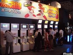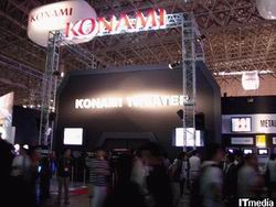 首先是位于战台中央的KONAMI THEATER了,在这里放映着众多新作游戏的宣传影像,吸引了不少人驻足观看。在KONAMI THEATER的四周是《合金装备》、《心跳回忆OL》体验角、《幻想水浒传5》、等游戏的试玩区域。在每个试玩区中的SHOW GIRL服装都有细微的差别,都体现出了每个游戏的特色。