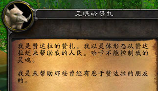 在祖尔格拉布深处,有一座静静的高台,周围毒蛇环伺,但是台上却不是Boss,而是一名老者的灵魂――无眠者赞扎。他就是赞达拉的精神领袖,他以灵体的形态赶来祖尔格拉布,哈卡不能控制他的灵魂。