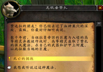 数千年前,当祖拉曼帝国的巨魔与入侵的高等精灵“***”作战时,高等精灵盗取了赞扎的强大魔法,在自己的武器和护甲上附魔,以此征服当地的巨魔。这就是我们在厄运之槌和燃烧平原的精灵们所给予的各种秘药。但是这种秘药在巨魔看来是不纯的,不过是小孩子的把戏。现在赞扎的灵魂将会帮助你把这些秘药提纯,使用原始哈卡莱的紫色护具,神奇的****,将秘药变成更加强大的附魔药―― 战士赞扎附魔 材料:防护秘药 盗贼赞扎附魔 材料:急速秘药