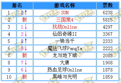 《SUN》又回到当仁不让的位置,《抗战online》也下滑了2个名次,部分游戏也都在下滑状态,看来06年的新游戏冲击力真是不小啊。进步最大的新游就是另一款高端国产三国题材网游《一骑当千》,据说这款游戏将在06年第一季开始测试,游戏大概的主题就是玩友扮演一个小兵,白手起家,建城、招兵买马、发展内政、攻城掠地……如此开放以及游戏自由度这么高的网游,真是值得相当的期待。《仙侣奇缘2》的封测帐号更是供不应求,更被一些玩家以15元左右1个的价格在网上贩卖。《三国策4》作为SLG类型的三国网游独树一帜。目前谁又能撼动《三国策》系列在三国SLG网游领域里的地位呢?