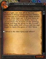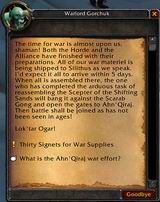 战争即将来临!联盟和部落的准备工作都基本完成,战争物资已经在运往希利苏斯的路上,它们将在5天后抵达希利苏斯。当所有的物资都抵达的时候,完成流沙节仗的英雄就将敲响甲虫锣,打开安其拉的大门,一场世纪大战即将爆发。