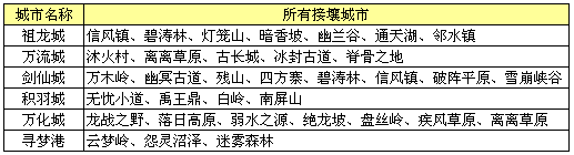 在图中所有领土中,按级别分是1、2、3等三级,其中1级领土只有祖龙城和万流城两块领土,属于最高级领土;其次的2级领土包括积羽城、万化城和剑仙城等3个新手城和寻梦港等4块;剩下的其他所有领土都同为3级领土。占领不同等级的领土,帮派的所有成员都可以享受不同等级的优惠,例如占领最高级的祖龙城后,帮派的所有成员将可以免费传送至任意一个已知的传送点。