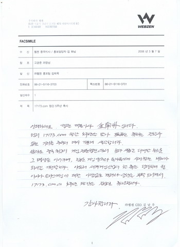 韩国著名游戏厂商WEBZEN代表理事金南州发来贺词祝贺17173创立5周年。