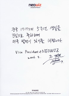 韩游戏厂商NEOWIZ副总曺季铉亲笔贺词