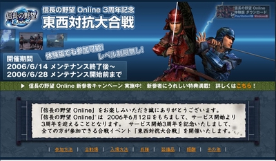 为纪念上市至今满三年,日本KOEI网络游戏《信长之野望Online》,将从6月14日起推出为期两周的纪念活动“东西对抗大合战”,让服务器里的玩家来场不分国家的大混战。“东西对抗大合战”已是第三次举行,从各国的大名、武将中由玩家投票选出较受欢迎者,成为合战活动里的镇守要害NPC,并能获得系统所分配的装备,进行一场不需成本的战争。