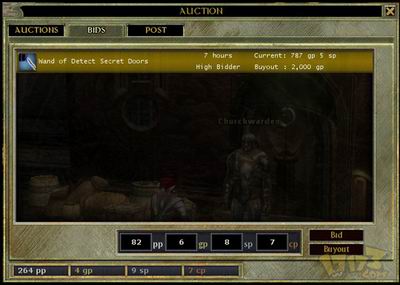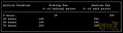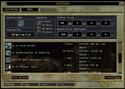 开始拍卖,玩家首先需要与拍卖师交谈,进入拍卖界面。同时必须付给拍卖师两笔佣金:记录费用和拍卖费用。这些费用由拍卖持续的时间决定。注意,如果交易终止了,你仍然需要支付拍卖师这些费用。[详细查看>>]