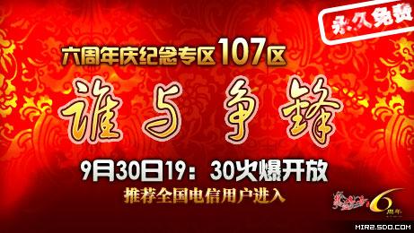9月30日,传奇人的热血将再次燃烧至鼎点:为了纪念这具有划时代意义的时刻,当晚19:30分,六周年纪念专区107区,将盛世开放!传奇六年,谁与争锋!在这激情燃烧的时刻,让我们携手共同见证!