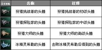 《天堂II》五章新增了5种狩猎头箍,其中的4种可以通过狩猎一般的狩猎BOSS获得,而“冰精灵希勒的头箍”需要通过狩猎“冰精灵希勒”获得。