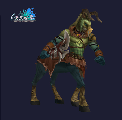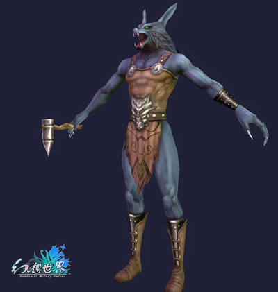 狼头人身,两只耳朵上翘,嘴巴像狼的嘴巴一样,皮肤呈蓝。身上穿着一件有点破的兽皮衣,手臂露出,肌肉明显。直立行走,脚上穿着一双和衣服同样质地的皮靴。眼睛始终很仇恨的看着远方。