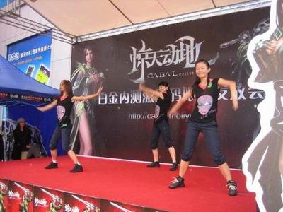 2.街舞表演:《惊天动地》在游戏中加入了舞蹈的元素,不同的职业和性别在游戏中会跳出不同的美丽舞姿,而现场几名年轻貌美的女孩则将游戏中这一流行元素通过街舞表演的形式展示给大家,引起了一片掌声。