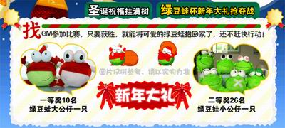 想要在圣诞节期间与GM来一场线上比赛吗?“绿豆蛙杯新年大礼抢夺战”期待你的参与,凡是参与线上比赛者,都有机会将可爱的绿豆蛙公仔抱回家哦!绿豆蛙表情公仔、绿豆蛙圣诞情侣公仔,你喜欢那一款呢?赶快动手参与我们的圣诞活动吧!