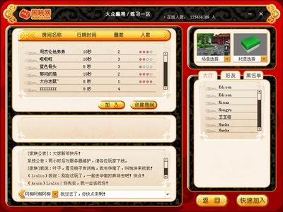 游戏大厅里提供多款游戏模式,同时这也是玩家的网络会客厅。在这里玩家可以互相添加好友,聊天,密语等。内测版本增加了练习模式,游戏的口号是人性化的“我的桌子我做主”,玩家可充分自由建桌和选择朋友进行游戏。独特创新的“自动配桌”系统,再也不用在人满为患的游戏室内苦苦找寻空位。另外如果进行比赛时,系统的自动过滤功能将会自动过滤玩家IP地址,将同一地址的玩家分配在不同的牌桌中,以杜绝玩家联合作弊。除此之外,游戏中还有一些隐性设置,将作弊现象扼杀在摇篮之中,还网络游戏一个干净的空间。