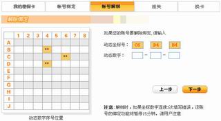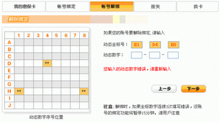 并且根据系统随机给的三个坐标,正确填入矩阵内对应位置处的数字后,解除帐号和密保卡的绑定。