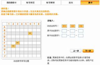 第二步系统随机给出三个坐标,分别填入旧密保卡对应距阵位置处的数字,以及新密保卡对应矩阵位置处的数字,全部正确后会解除旧的密保卡和帐号的绑定,同时给帐号绑上新的密保卡。