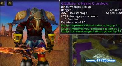 以上装备是来自于在美服的中国玩家“跳水淹死的鱼”为我们带来的竞技场新装备预览及属性效果图,据这位玩家介绍在竞技场里所拥有的武器比料片开放的副本所出的武器要好,看来竞技场将会成为许多没有RAID的玩家向往的地方,这位玩家还说到,他是他们公会的MT,穿着在资料片开放的一身蓝装,无BUFF状态下的血有11300,有BUFF状态下的血有15000,防有13000左右,真是相当的可怕,呵呵,以后NAXX只要20人副本了……