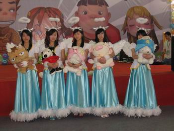 海之童本次携最新Q版网游《童年》参展,12个天使造型的美女一亮相便成为全场的绝对焦点,由于28日为专业观众日,到场的专业记者、媒体纷纷驻足观看,众多观众都前来合影拍照。天使MM出场后玩起了我们童年时代的游戏,热烈的场面吸引得众多观众参与进入我们的游戏,