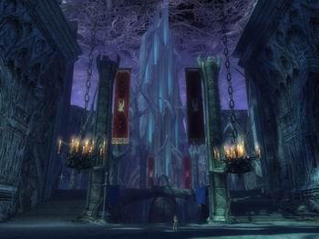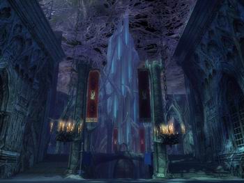 作为库尔兹克的首城,风荷议院坐落于科瓦德森林中部,那是他们的**中心。整个建筑是从若干个巨大的已经石化的参天大树改造而来的。虽然是如此,但其建筑的精美程度却丝毫不比凯珊其他精美的建筑要差——树干被利用起来,成为了天然的房柱;树冠累叠在一起,就成为了屋顶,用来避雨遮阳。库尔兹克人用巨大的砖石将地面铺平整,并在墙壁上雕刻出精美的图案与花纹。由于整个科瓦德森林都比较阴暗,使得风荷议院顶部的采光会有一些困难,但库尔兹克人还是用自己的方法解决了这个问题。他们在大厅内点满了蜡烛,并为大厅里提供了足够的照明。烛光的效果为整个风荷议院带来了别样的感觉,也为这个库尔兹克人心中的高贵之地增添了几份庄重与神秘。