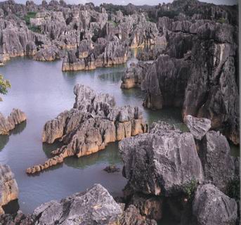 风荷议院这样一个在石林中建起的城市虽然在现实世界中很难找到原型,但科瓦德森林这样一个“石头树林”却是可以找到其创作灵感来源的,这应当就是位于中国广西、世界闻名的石林。石林是喀斯特地貌的一种特殊类型,因高大的石灰岩溶柱密集组合、呈林状分布而得名。除典型的石林地貌以外,石林国家公园内还发育了各种其他相关喀斯特地貌成分,如石牙、溶丘、洼地、暗河、湖泊、瀑布、溶洞等,它们与公园内的植被类型和地下水系统一起,共同构成了一幅从地上到地下完整的高原小流域喀斯特全景图。