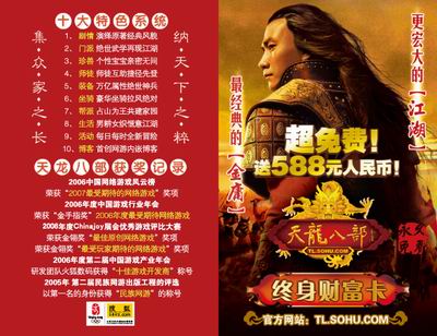 特别提示:公测后,击杀BOSS或宝藏洞5层的小怪,即有机会获得天龙终身财富卡,所掉财富卡归其本人所有。终身财富卡将在玩家40级时免费赠送价值50元的人民币元宝赠点,50级送100元,60级再送100元,70级送150元!到80级再送188元!总价值588元人民币的奖励全部免费送!除了缉拿宝藏洞的BOSS以外,玩家还可以通过以下途径获得终身财富卡: