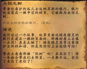 “我听过一个故事,故事里面说暗夜精灵的银行是建在一棵树里面的,那棵树看上去像一头熊!真是太酷了!暗夜精灵非常注重保护自然的和谐,但是熊熊听上去就很可怕!带我去看看那棵‘熊树’吧?求求你了!有一条船会带我们去那里,一点都不远,求你了求你了求你了~”