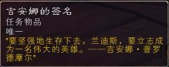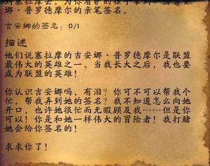 “他们说塞拉摩的吉安娜·普罗德摩尔是联盟最伟大的英雄之一。当我长大之后,我也要成为联盟的英雄!你认识吉安娜吗?你可不可以帮我个忙,帮我弄到她的签名?我不知道怎么向她开口,也许她很忙而无暇顾及我……但是你可以!你是和他一样伟大的冒险者!我打赌她会给你签名的!求求你了!”