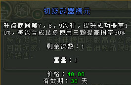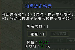 神佑礼包:当玩家到达30级,就可以打开神佑礼包,里面将送给玩家相当实用的药品道具,同时还会为玩家送上黄金武器,鸟枪换炮的感觉一定不同凡响,此时还有可能抽取价格好几十元的初级武器精元和装备精元!