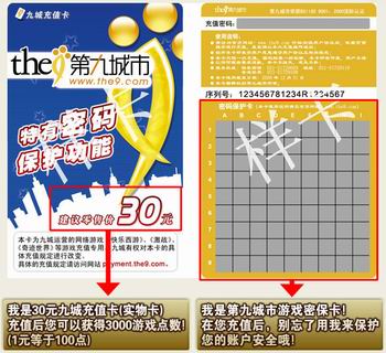 随着30元九城充值卡(实物卡)提供的3000游戏点数外,它可是还附送第九城市游戏密报卡的!有了它你就和我一样安逸的慢慢了解吧,再也不用担心游戏密码被盗而在每次登录游戏前修改密码,游戏结束后再将密码修改回来了。