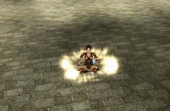 驾剑飞行、驾云上天等法术在神话小说中可是屡见不鲜,可《十面埋伏OL》却是一款写实风格的武侠网游,我们当然看不到这些。不过,我们的测试员却发现,只要在角色盘坐歇息时左右键齐按,人物身下便会出现一层光环、以观音坐莲的姿势迅速升上天际。这可比那些神话故事中的飞行方式酷多了!