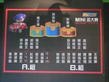 前8强采积分赛,“赛车手的传说”吴文德、“吃饱饱睡好好”林仓成以积分相同为第二名,现场加赛一场采三战两胜制决定谁是亚军,结果冠军、亚军、季军分别为胡淞智、吴文德、林仓成,后两者分别可得到奖金 1 万元、5 千元。
