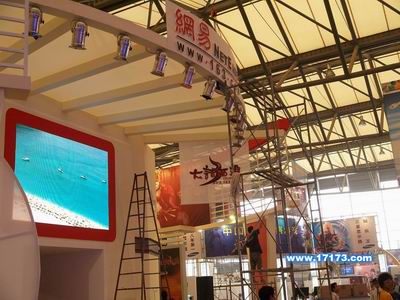 这是搭建中的网易展台,《大话西游3》是网易这次出展游戏中的重中之重。