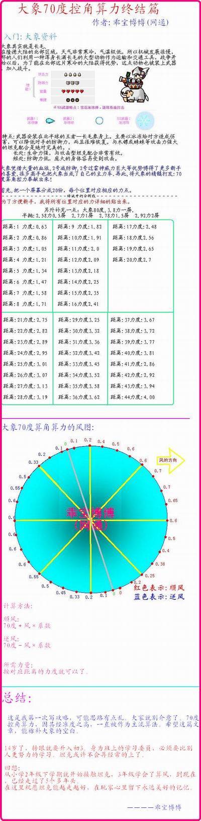 近日某个清晨,《宝贝坦克》论坛GM小金在对官网论坛进行例行巡查时,发现了一篇图文并茂的技术性攻略。它构思新颖,题材独具匠心,段落清晰,情节诡异,跌宕起伏,主线分明,引人入胜,平淡中显示出不凡的文学功底,可谓是字字珠玑,句句经典,是所有坦克玩家应当学习之典范。就纯打炮技术分析攻略的角度而言,这篇帖子可能不算太成功,但它的实验意义却远远大于成功本身,正所谓一马奔腾,射雕引弓,天地都在我心中,震撼啊……GM在心底赞叹完毕,就随手关掉这篇攻略,看其它贴子去了。因为这篇大象控角算力攻略里一张算风表有错误,因此无法上精华推荐。