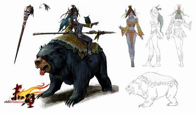 先看这张图,看到这张图首先想到的就是三国演义中的南蛮之人,他们有着古老的风俗习惯,喜欢和动物们一起结伴,很多女人都有一定的巫术,让人后怕不已;而男人都是身强力壮,手持长矛,靠树藤呼啸游荡。再看图上的熊,熊是非常具有攻击能力动物,体形庞大,力量凶猛,再加上它凶狠的性格,还有那锋利的爪子,绝对是战争时期的首选攻击宠物,当然你也可以把它看成一头坐骑吧。最后再看武器装束,有金属的削尖头长矛,也有镶嵌着骷髅头的法杖,是否会联想起拿时诸葛亮七擒孟获的困难呢?也许那些长矛上带有一定的毒药,也许那些骷髅法杖上会有一些降头魔法,这些都让武器有一定的使用价值。当然这些武器也会在《赤壁》中出现,还处于古老部族状态的巴纳洞人就使用这样的武器,难道他们的武器也具有同样的使用价值么,那只有在游戏中才能看到了。