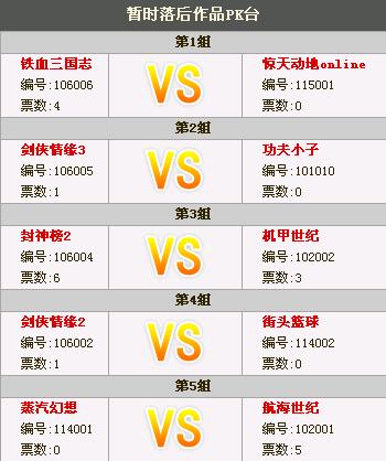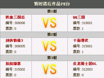 本轮比赛依然有些分组未分出胜负,按照PK规则,PK获胜的作品将恢复正常投票,PK所得票数也将计入正常投票,PK赛失败和投票仍为0票的作品将继续留在PK台,与本周正常投票中落后的作品继续进行PK。现公布第三轮的PK名单如下:
