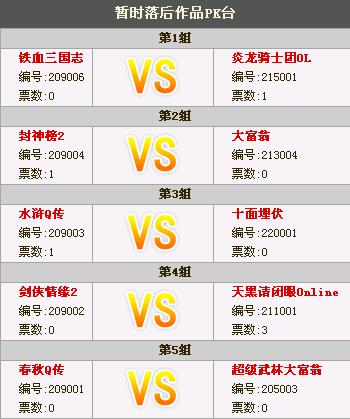 从这次的名单中我们可以注意到一些第一轮PK中胜利的作品又再度回到了PK台上,看来虽然会有一周的“PK免役”权,不注意守住胜利果实也仍然是要回归的。第二轮PK获胜的作品也将获得一周的“PK免役”权,但可要小心不要再度回归了,本轮PK之后就要进入终极的第四轮PK了,失败者将被取消参赛权。