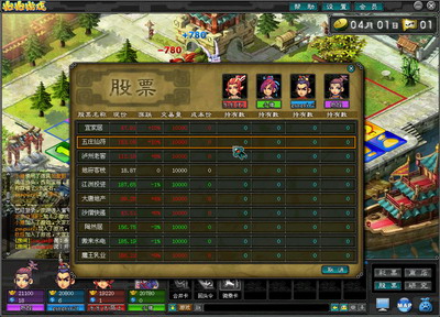 在富甲西游的右下角,有四个选项:彩票、商店、股票、研究,就是老鸟们常说的四选一,每个回合都可以从里面选择一个进行操作。选择股票按钮,将弹出一个股票交易窗口,跟炒股软件非常类似,红色表示涨,绿色表示跌。很多人从来都不敢碰股票这个按钮,其实富甲西游里的股市操作并不复杂,掌握好股票的话,财富可是轻轻松松的翻倍哦!