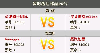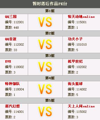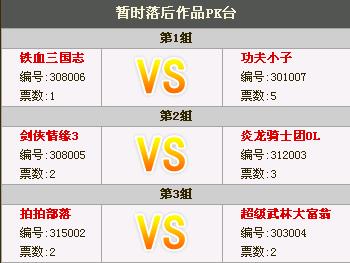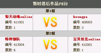 话归正传,三轮PK已过紧张刺激并且残酷的终极PK赛即将拉开帷幕,本轮PK落后的游戏将被失去参赛资格,告别本次比赛。一路走来,不论成绩好坏,这些游戏始终是作为本次比赛中的一份子,本轮的PK多少有些惨烈了,谁将悲情的从支持者面前黯然离去?无论如何,让我们拭目以待最终PK的结果。现公布第三轮的PK结果(票数截止2007年9月18日16:00)如下:
