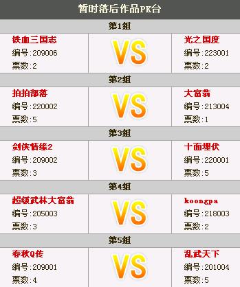 预计本轮比赛的票数同之前2轮相比会有了较大浮动,名次的争夺也激烈了许多,这关键的一周“PK免疫”权异常抢手,按照PK规则,PK获胜的作品将恢复正常投票,PK所得票数也将计入正常投票,PK赛失败和未分胜负的作品将继续留在PK台,与本周正常投票中落后的作品继续进行PK。不过,即将开始的终极PK中如果仍然落后的话将不会再有机会复活了。现公布终极PK名单如下: