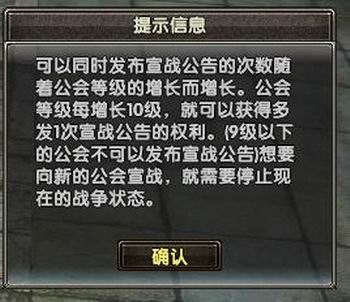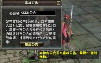 进入联邦行宫后,可与皇家近卫队对话,选择“购买公会相关物品”,进入之后买下“宣战卷轴”,一个宣战卷轴只能对一个公会宣战,如果需要对多个公会宣战,不仅要购买相应个数的宣战卷轴,对公会等级的要求也是很严格的,可以同时发布宣战公告的次数随着公会等级的增长而增长,公会等级每增长10级,都会获得多发一次宣战公告的权利,9级以下公会是不可以宣战的(可以通过在每个城镇的开拓官处购买提高公会等级)。