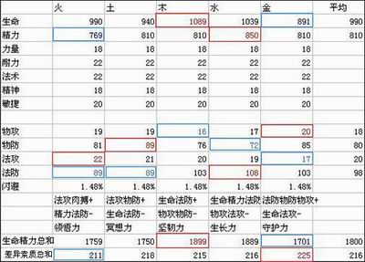可以看到,耐力、法术、精神、敏捷、闪避完全由职业决定,而生命、精力、物攻物防、法攻法防则有些许落差,有的项目甚至达到了接近1/5差异,可见五行属性对角色的影响。更何况,随着角色成长,五行属性导致的差异还会更加明显,玩家完全可以通过五行选择来培养合适心仪的角色。