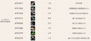 英雄多出于乱世,乱世多有煞破狼之征。七煞者,乱世之贼;破军者,天下之雄;贪狼者,诡谲之士。破军,即对应天上斗北第七星之破军星,主杀伐变革之兆。破军虽勇,命却福薄,如三国时的桓侯张飞。故,侠客欲成破军命而图纵横霸业时,必历天劫。而这“破军天劫”套装,正可助其安然而渡。