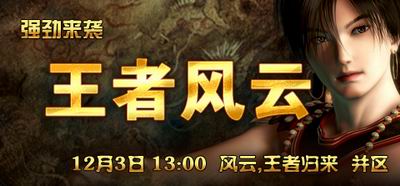 2007年12月3日13:00-12月5日12:00风云、王者归来将进行并区工作,届时服务器将停机转移数据。新区开区时间为12月5日12:00,请玩家及时更新客户端服务器列表。