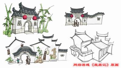 上图是扬州民居建筑原画,一个个东倒西斜的民居设计,定会给整个扬州城带来无数令人绝倒的笑料,玩家是否也会穿梭在扬州的这些民居之间,追寻小宝的影子呢?刚说到影子,影子来了,有心的玩家一定已经发现,图中民居前竟然有两个神秘人物的身影,他们到底是谁?