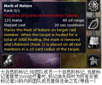 1。自然标记:给你的队友1个标记该人所受的治疗量超过3K的时候,标记消失并且给周围10玛的队员每人上1个绽放。。