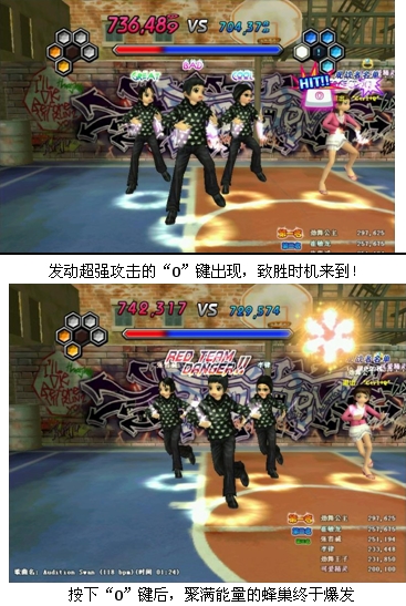 积分条左右各有一个蜂巢状的计数器,分别代表每队集体打P的总数,每打出一P蜂巢就能满一格,当5格全部打满后按下“0”键,此时最强攻击发动,可以把对方打到爬不起来哦!