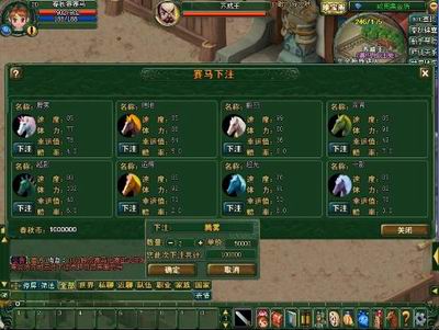 刚刚过完圣诞节,节日的快乐情绪还不曾减退,日历又不经意的翻了几页,转眼间08年就要到来,你是否早已按耐不住心中的喜悦,想找个机会与朋友尽情的狂欢,那么这次田忌赛马活动的全线开放定会让你们的快乐情绪尽情释放。胭脂马腾雾、枣红马绝地、白龙马翻羽、黄鬃马逾辉、藏青马十影、四蹄踏雪马超光、青鬃兽越影、麒麟兽奔霄八款精品良马任你挑选,拉着你的朋友,挑选自己钟爱的马匹,在自己的服务器里,一场刺激且充满乐趣的比赛就能开展。